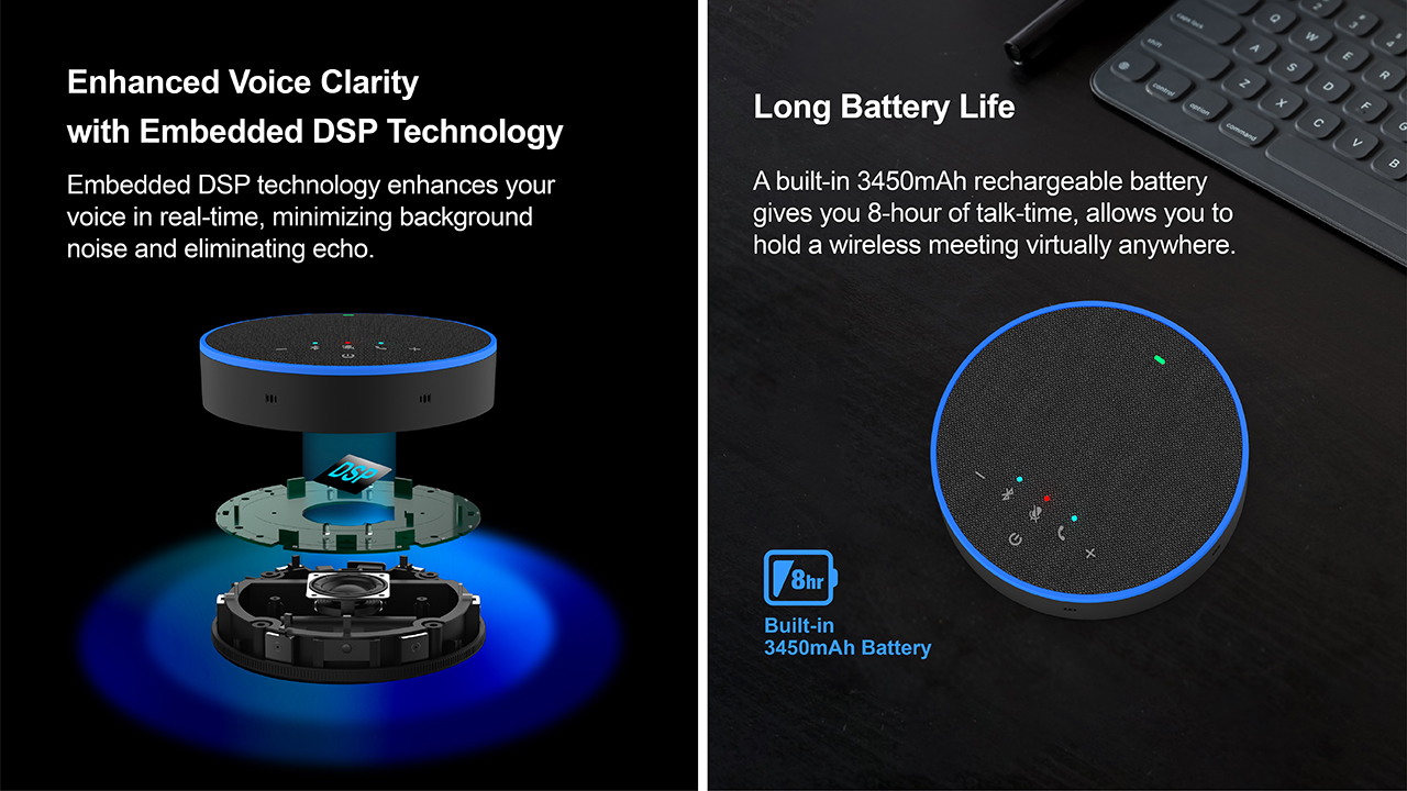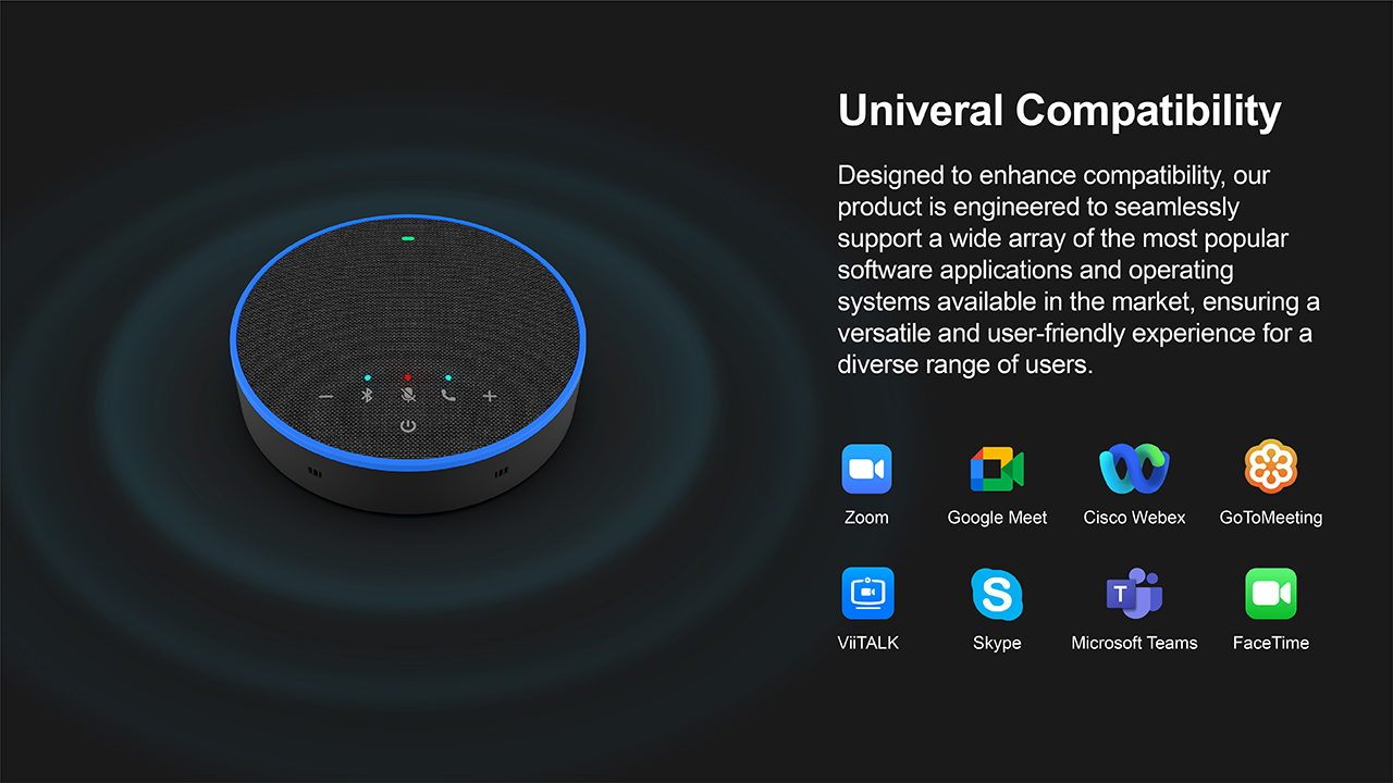 The AB03 is the portable conference speakerphone that rewards you with plug-and-play connectivity for connecting to meeting room disply, laptop, and smartphone via bluetooth pairing or USB wired connections. To let you feel free at any edge of the office room, AB03 packs itself with crystal-clear sound, including the 360 ̊ omnidirectional voice pick-up, build-in 6 microphones array, full duplex, and audio DSP technologies without echoes or distorted sounds even at max volume level. To enhance your conference call experience, AB03 is fully compatible with commonly used calling software, gives you the power to turn anywhere into a conference room. Via ViiMic’s AI Speech-to-Text feature for use on IFPDs, the AB03 provides instant on-screen voice-to-text and multi-language translation during conference calls, breaking language barriers.