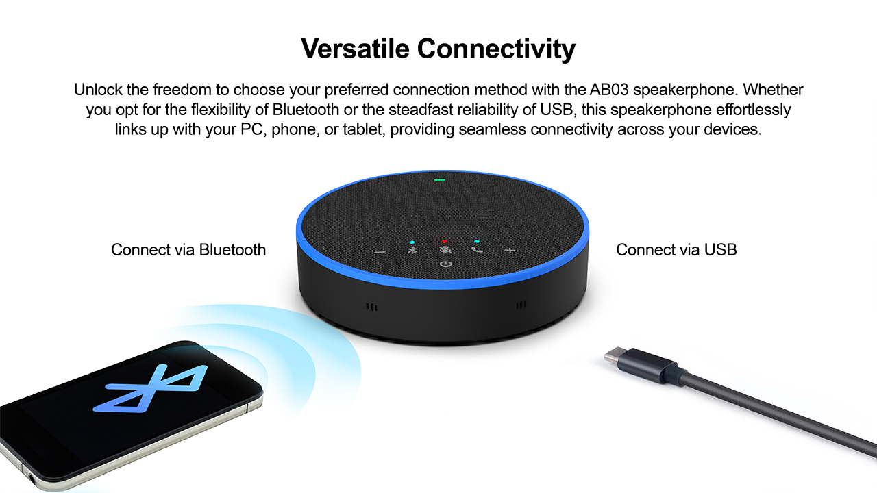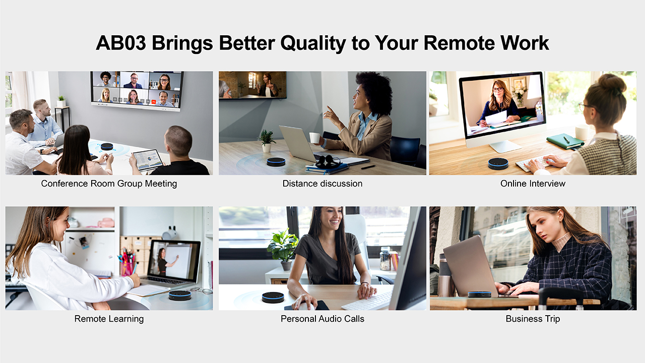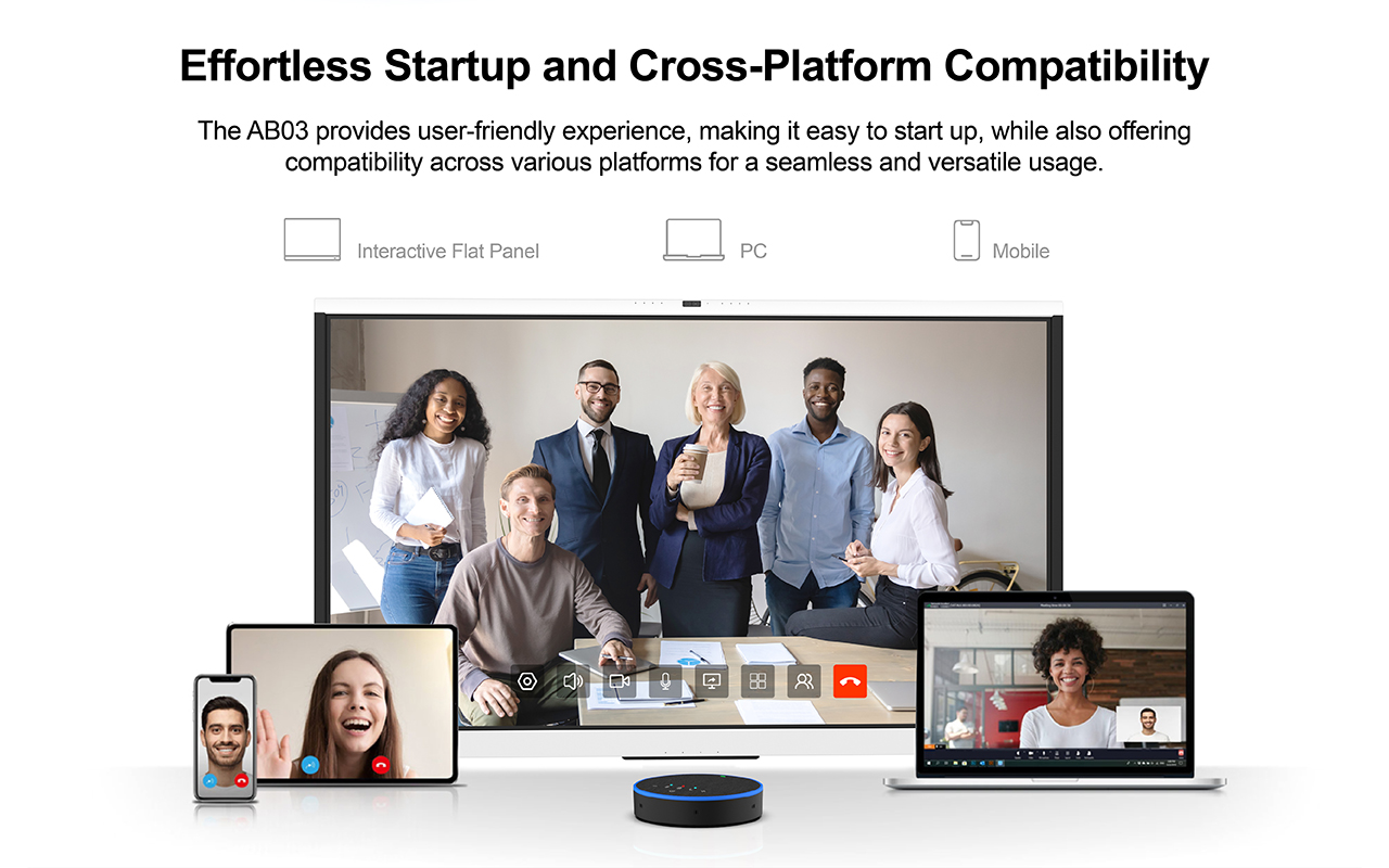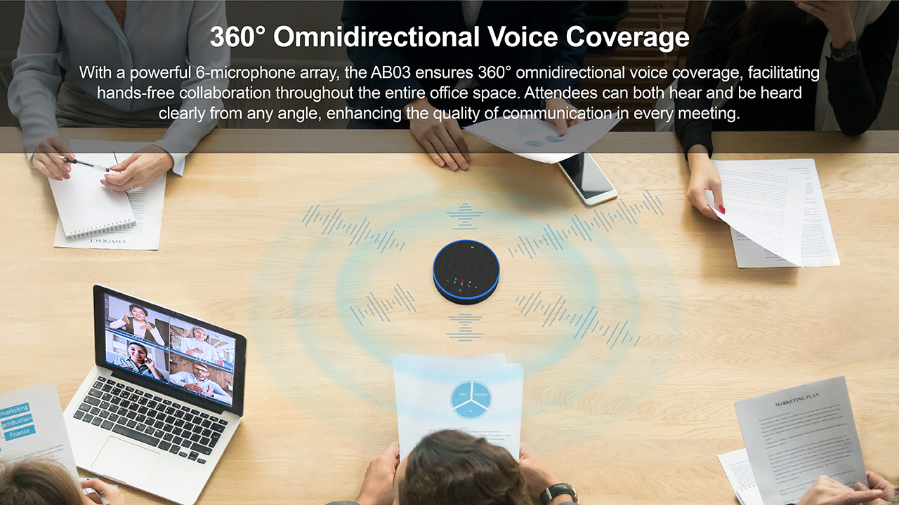Benefit from Full Duplex and Sound Localization Technologies with the AB03. Full duplex allows multiple users to speak simultaneously without interrupting the ongoing conversation, while enhanced sound pickup from all directions creates a natural and smooth communication experience, akin to face-to-face interactions.