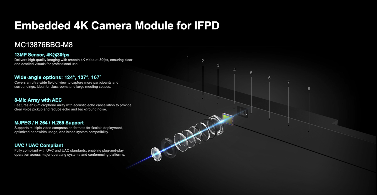 Support for MJPEG / H.264 / H.265, along with UVC / UAC compliance, allows the module to function as a standard USB camera for seamless integration with IFPD platforms and mainstream operating systems.
