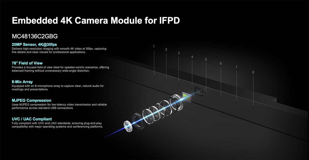 MC48136C202GBG-M8 is a standardized camera module designed for Interactive Flat Panel Display applications, optimized for seamless integration in environments with high compatibility requirements.