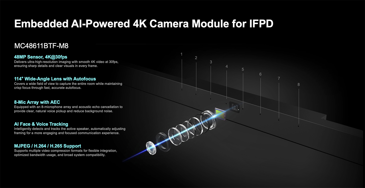 MC48611BTF-M8 is a single-lens AI camera module designed for Interactive Flat Panel Display (IFPD) applications, suitable for standard meeting rooms and classroom environments.