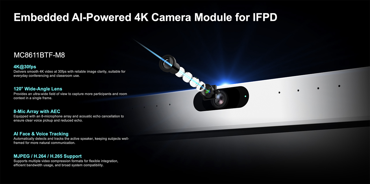 MC8611BTF-M8 is a single-lens AI camera module designed for Interactive Flat Panel Display (IFPD) applications, suitable for general meeting and classroom environments.