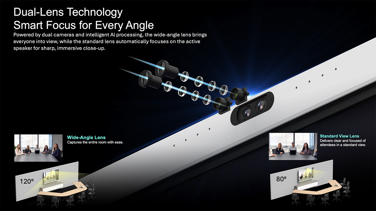 Equipped with dual 50MP delivering 4K @30 fps output, it features a 120° ultra-wide field of view for broad room coverage.