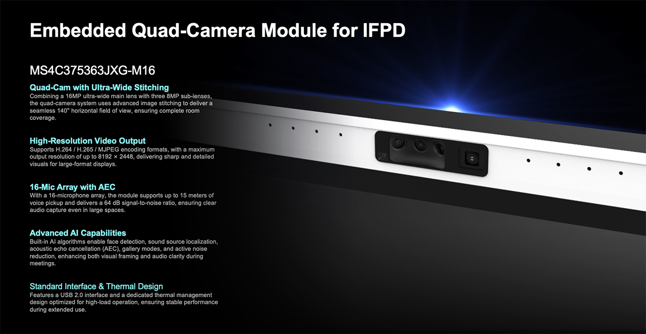 MS4C375363JXG-M16 is a quad-lens AI camera module designed specifically for Interactive Flat Panels, targeting smart meeting and classroom applications.