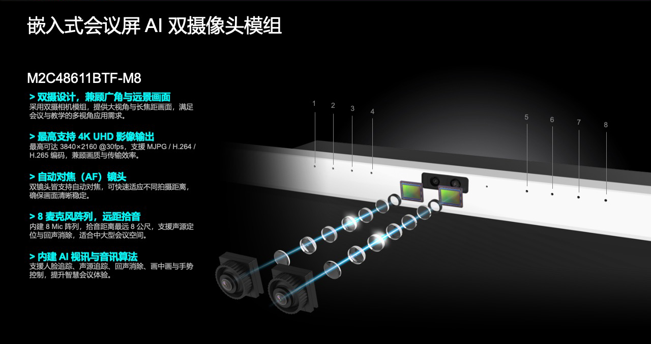 M2C48611BTF-M8 是一款面向 交互智能平板(IFPD) 应用的双镜头 AI 摄像模组,适用于中大型会议室与智慧教学场景。