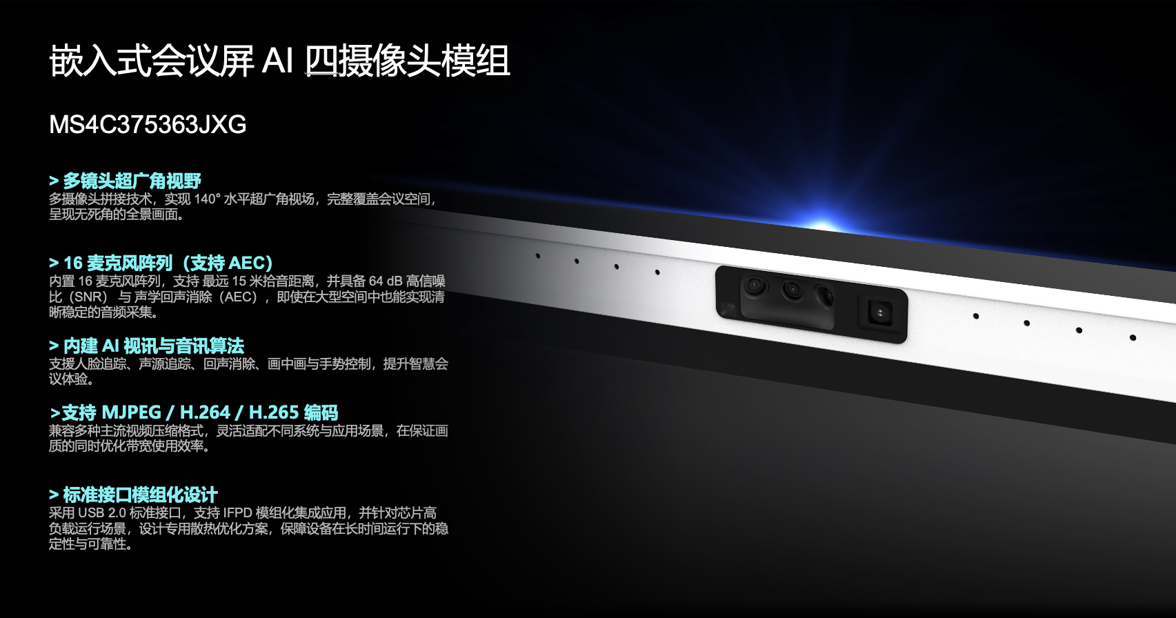 MS4C375363JXG 是一款专为 交互智能平板(IFPD) 打造的四镜头 AI 摄像模组,面向智慧会议与教学应用。