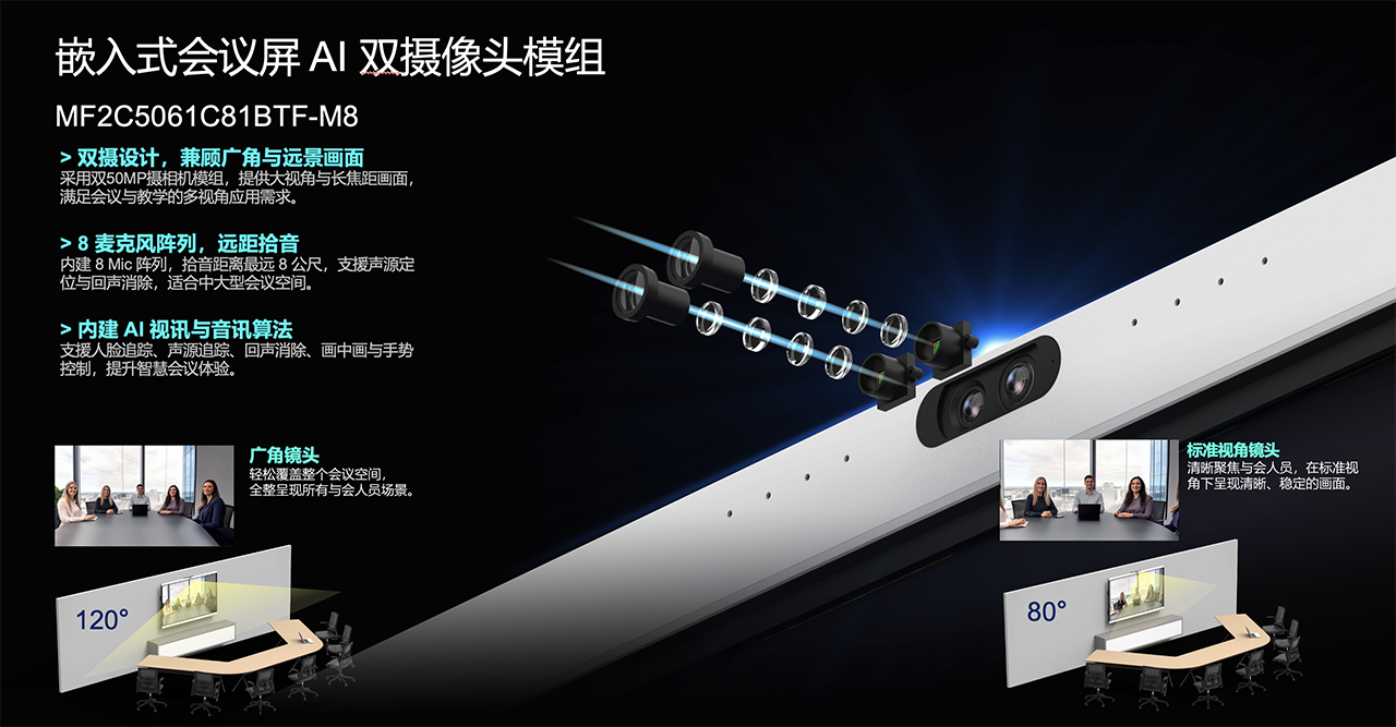 MF2C5061C81BTF 是一款面向 交互智能平板(IFPD) 的双镜头 AI 摄像模组,适合中大型会议室及教学空间应用。