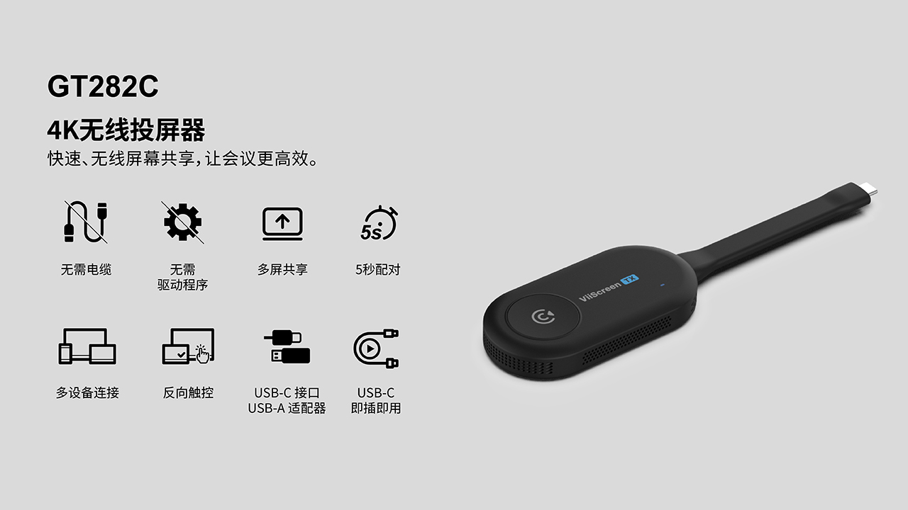 GT282C融合4K无线投屏、一键投屏、USB-C即插即用、触控回传及跨平台兼容等功能, 是一款高效稳定的会议投屏设备,适用于企业会议与教育场景。
